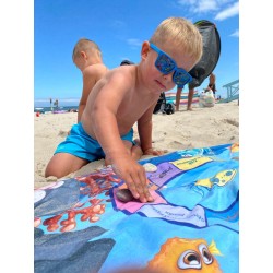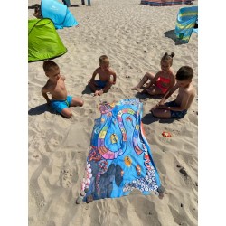 Materiał-mikrofibra o właściwościach szybkoschnących,wchłania siedem razy więcej wody niż sam waży i trzy razy więcej niż ręcznik bawełniany o tej samej powierzchni i gramaturze,przyjemny dla skóry. Ręcznik zadrukowany jest po obu stronach i dodatkowo ma gumkę do jego złożenia.