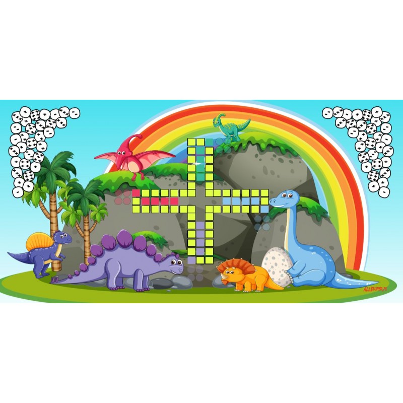 Każdy z graczy musi mieć 4 swoich pionki i ustawić je przy wybranym dinozaurze. Wejście na planszę następuje po trafieniu na pole z 6 plusami i 1+.